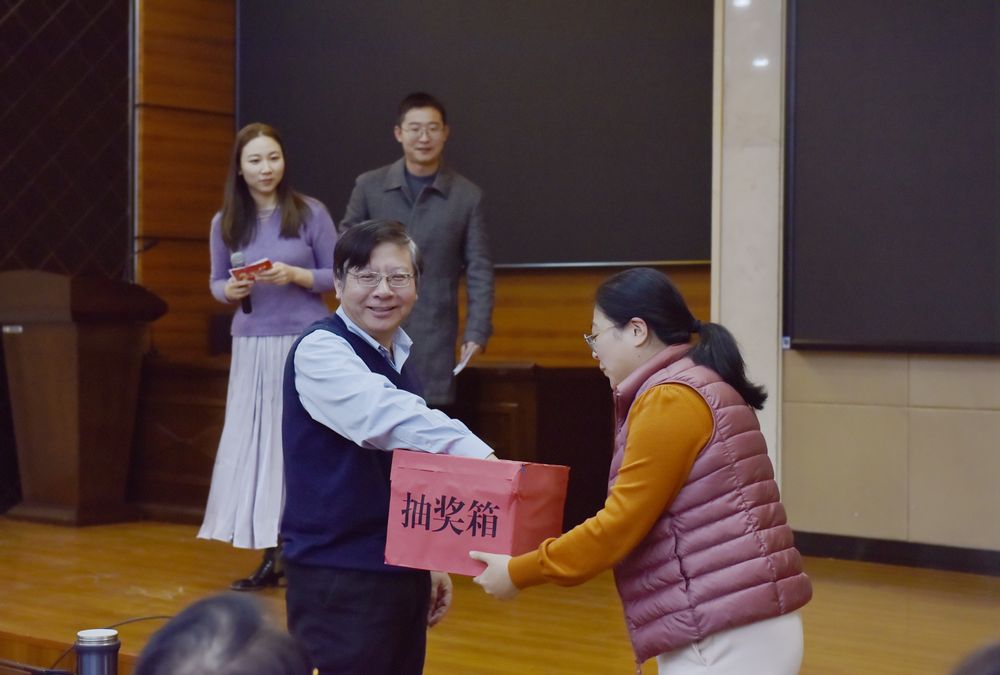 在激动人心的抽奖环节,学院领导班子成员从众多奖券中抽出幸运的老师们。领奖的老师脸上洋溢着难以掩饰的笑容,接受来自全场的祝福。这一时刻不仅为获奖者带来了好运,也为其他老师增添了无限乐趣。