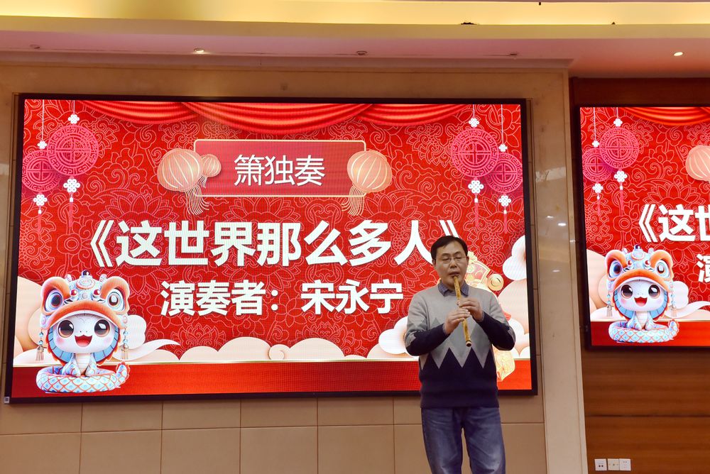 宋永宁老师的箫独奏《这世界那么多人》则是一段宁静而深邃的艺术享受。当悠扬的箫声响起时,整个报告厅瞬间安静下来,。在这一刻,音乐成为了连接所有人内心世界的桥梁,让老师们意识到即使身处喧嚣的世界,也能找到内心的平静。