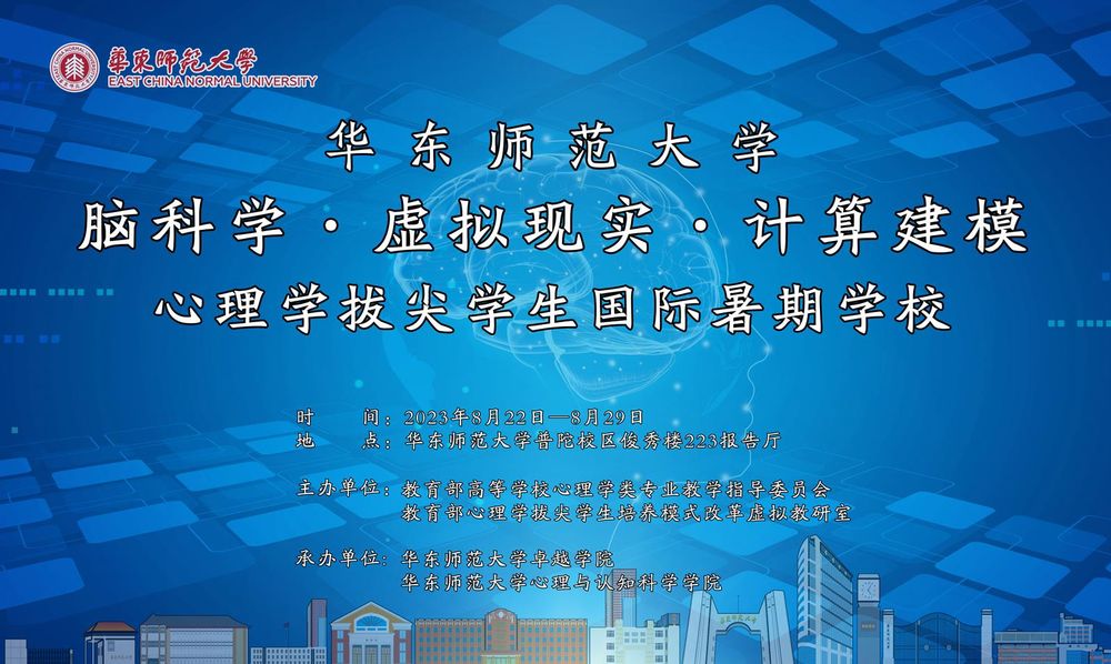 为深入贯彻落实《教育部等六部门关于实施基础学科拔尖学生培养计划2.0的意见》的要求,加快建设高质量的国际化培养体系,推动拔尖学生国际合作、学术交流向实质性、更高层次迈进,切实提升人才自主培养质量。由教育部高等学校心理学类专业教学指导委员会、教育部心理学拔尖学生培养模式改革虚拟教研室共同发起,华东师范大学卓越学院、心理与认知科学学院联合北京大学心理与认知科学学院、北京师范大学心理学部、华南师范大学心理学部共同承办的首期心理学拔尖学生国际暑期学校(以下简称“暑期学校”),于202382329日在华东师范大学普陀校区举办本期暑期学校的主题为“脑科学·虚拟现实·计算建模”。