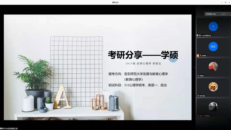 王云汐、胡丁鼎同学从保研流程、保研准备、推免复试几个方面进行了分享,并从如何获取夏令营资讯、准备申请材料和夏令营的具体流程,分享了自己的想法和经验。邓文静、邢梁玉、董凤然三位同学从专业选择、学校选择、复习计划等方面向准备考研的学弟学妹们提供了一些建议,包括科目重要性权衡、如何核对计划等等。也鼓励大家充满信心、积极应对。