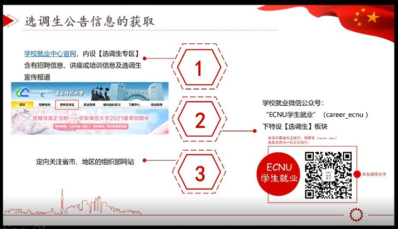 段言老师从选调生的定义、选拔条件、信息获取、报考流程等方面出发,结合最新一年的报考招录情况,为大家详细解读了选调生的相关政策。她提到,希望同学们积极加入选调生的选拔,到祖国需要的地方去建功立业,挥洒汗水,不负青春。杜芊芊同学从选调生笔试的题型及攻略、面试的细节及小贴士等向同学们分享了自己的备考经验,并给大家推荐了学习资源。