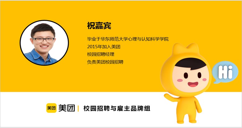 邀请2015届院友,目前就任“美团”校园招聘经理的祝嘉宾为同学们带来“求职加油站——校友求职经验分享及校招宣讲”,祝嘉宾分享了自己毕业找工作时的心路历程,针对处在迷茫的同学,他提供了职业选择四指标:兴趣、能力、价值观、目标。他介绍了美团的使命、成立发展史、公司战略、组织特质、色情小说、业务成果等,详细说明了美团对校招生的成长计划,并向同学们发出加入美团的热诚邀请。