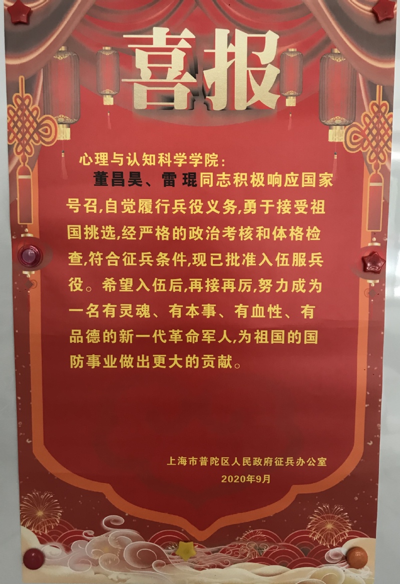心理与认知科学学院2018级心理学大类本科生董昌昊、2019级应用心理学系学术型研究生雷琨积极响应国家号召,自觉履行兵役义务,勇于接受祖国挑选,经过严格的政治考核和体格检查,符合征兵条件,获得批准入伍服兵役。特此祝贺!董昌昊和雷琨董昌昊、陶洁(辅导员)和雷琨