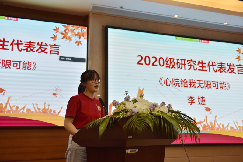 2020级研究生新生代表李婕,从《心院给我无限可能》出发,分享了自己在师大,从一个懵懵懂懂的大一新生,成长为能独立完成科研项目的研究生的历程。心院会给同学们无限可能,同时也这需要同学们勇敢地去探索,求实创造,砥砺前行,在心理学院找到前行的方向,乘风破浪,不负青春!