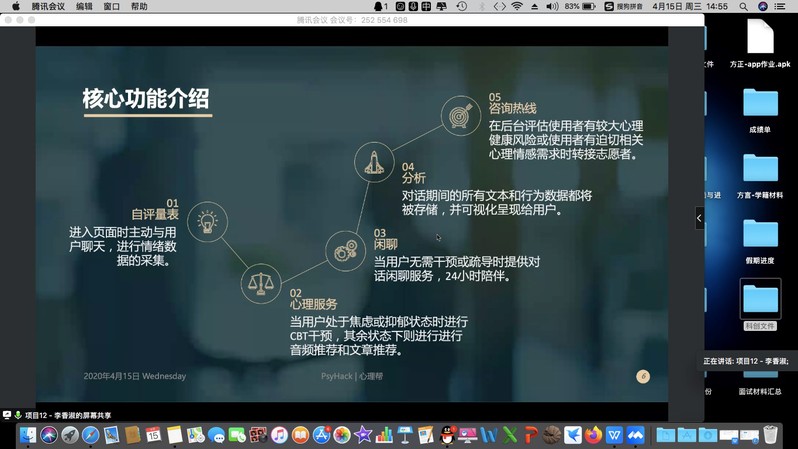 参加答辩的还有5个创业项目,分别是AI心理健康助手、老年心理支持专家、心理科普电台、针对中小学生的网络欺凌预防与应对教育软件、心理实验被试招募平台。