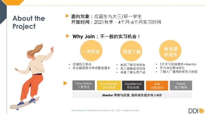 最后宣讲的公司是美资咨询公司——DDI,该公司一直专注与企业精英人才的评鉴与发展,深耕51年。宣讲人Iris提到,在DDI工作将有机会参与到不同行业头部企业的项目中,看到最顶尖人才的画像;剖析不同行业人才选、育、用、留的痛点,帮助他们解决问题;与来自多元文化背景的同事合作;在扁平的组织中获得独立性和价值观并更快成长。Iris还详细介绍了实习期不同阶段的培训与工作内容。
