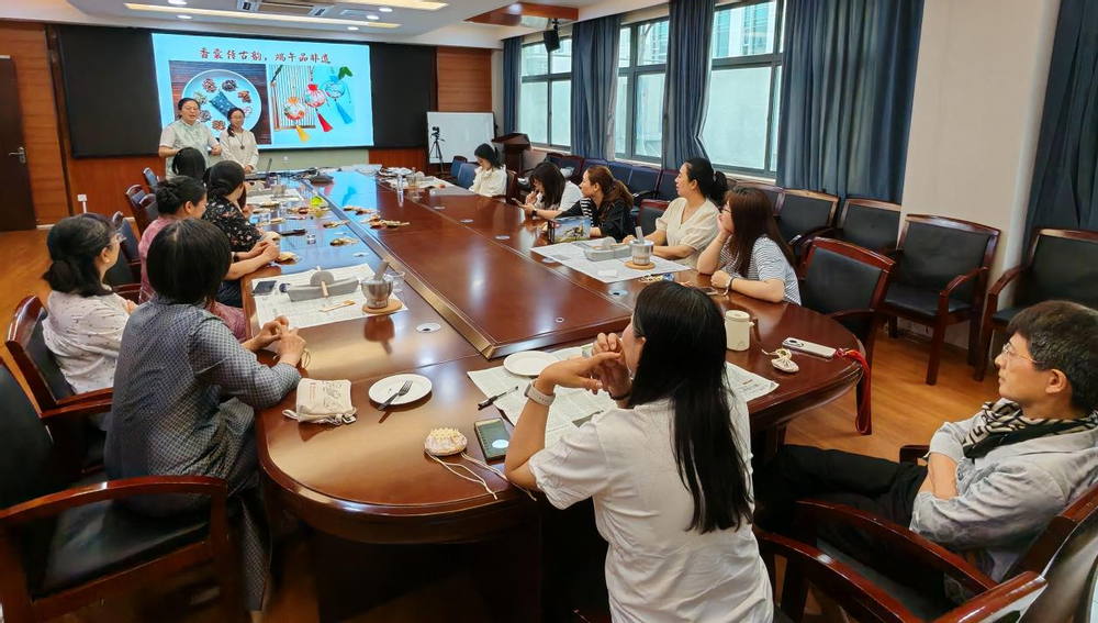 活动伊始,华东师范大学非物质文化遗产传承与应用研究中心研究员刘艳介绍了古法香囊的起源、类型、香料的类型和功效,之后老师们观察和体味了艾叶、藿香、丁香、紫苏叶、细辛、薄荷等14味香料,并依次将它们舂和捻成了粉末,再将香料一点点装入布袋,再制成一个个精美的香囊。老师们相互交流制作心得,分享经验,欢声笑语回荡在活动现场。