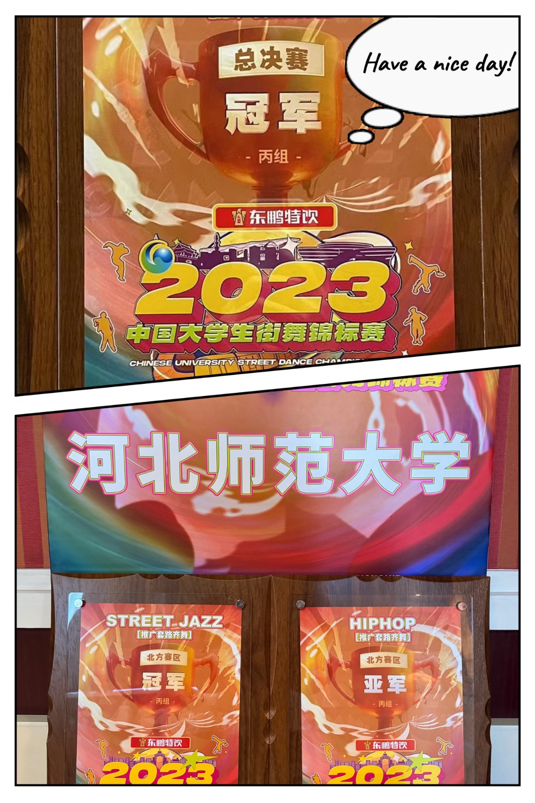 11月26日-30日,2023中国大学生街舞锦标赛(总决赛)在上海市松江区顺利举办。队员们克服人员更换、队形重排等困难,继续顽强拼搏,经过激烈角逐,最终获得丙组(高水平)齐舞比赛Street jazz冠军、Hiphop第四名,同时获得全场最佳完成奖。