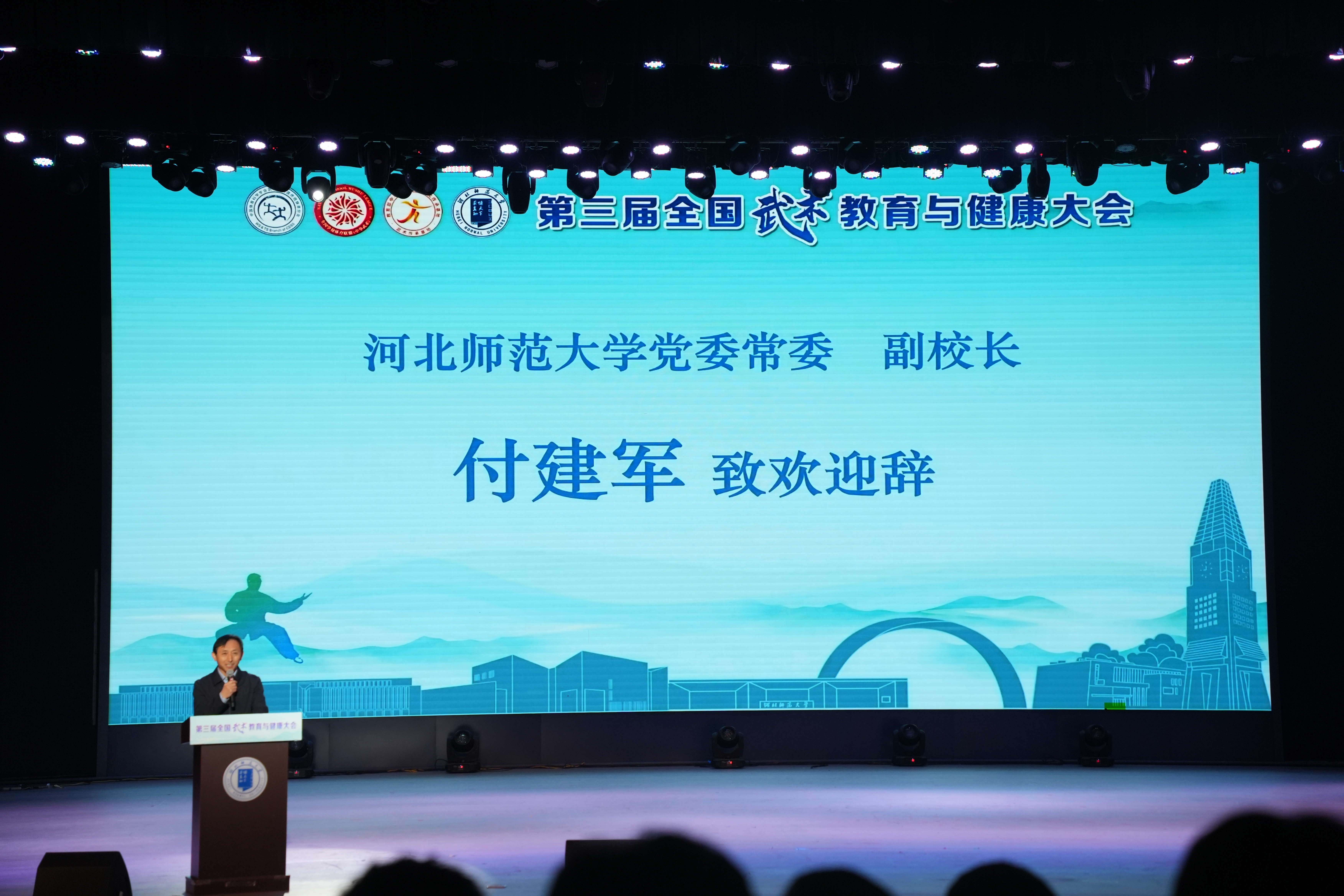 付建军在欢迎辞中指出,河北师范大学是河北省人民政府与教育部共建的省属重点骨干大学,河北省“双一流”建设一层次高校。河北师范大学将以此次大会为契机,以具有93的体育办学史为底蕴,发挥河北省唯一的“体育学”一级学科博士和硕士学位授权点、博士后科研流动站的学科优势,深入推进武术教育与教学改革,完善课程体系建设、强化师资队伍力量、以培养高素质的武术人才为目标,积极为弘扬中华优秀传统文化与增强文化自信贡献力量,努力打造武术教育品牌与特色。他表示,学校将通过创新教学模式与课程设计,推动武术教育的现代化进程,积极探索武术在弘扬中国传统文化、健康促进等领域的实践与应用,让武术成为树立文化自信、促进全民健身、提升国民健康水平的重要载体。