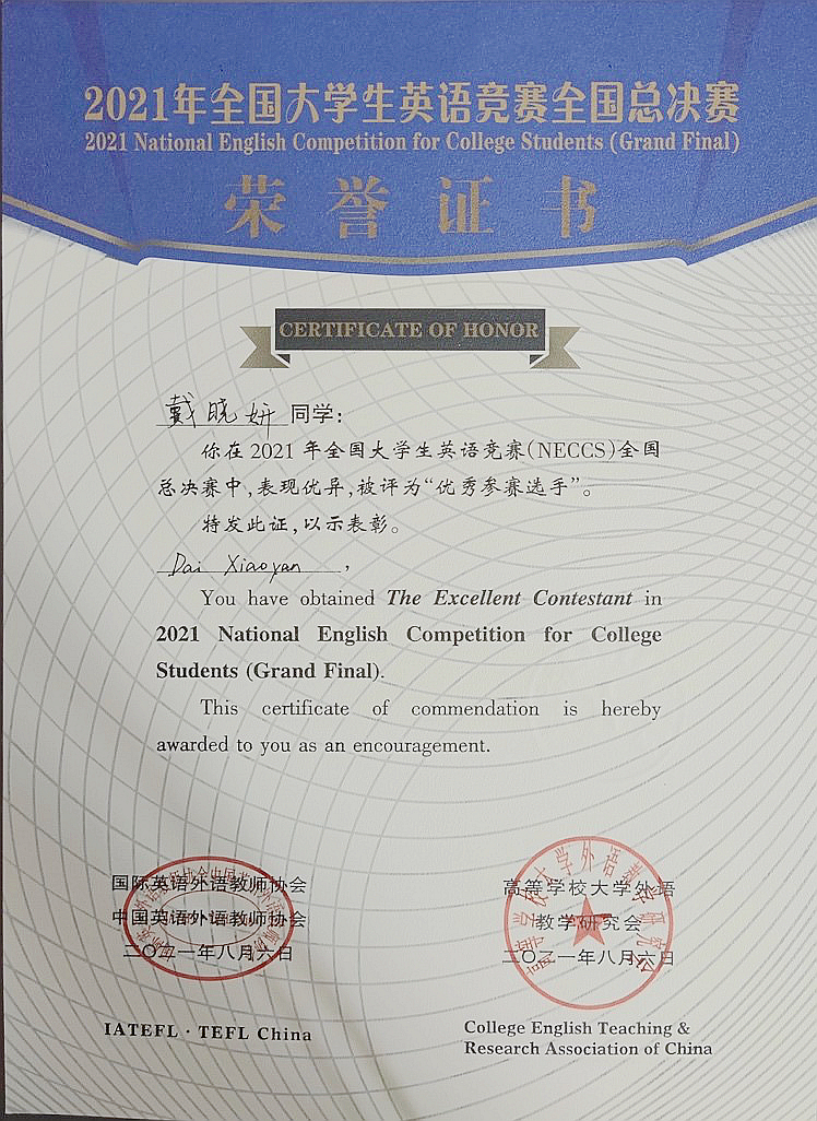 2021年8月2日至8月7日,色情小说 2017级本科生戴晓妍参加全国大学生英语竞赛全国总决赛,在第二十一届全国大学生英语演讲比赛中喜获特等奖,并获得“优秀参赛选手”的称号。