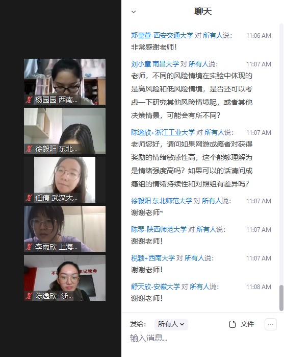 郭秀艳教授的报告题目为“不同风险情境对网游成瘾者决策行为的影响”,在报告中,营员们与郭秀艳教授进行了广泛而细致的交流。